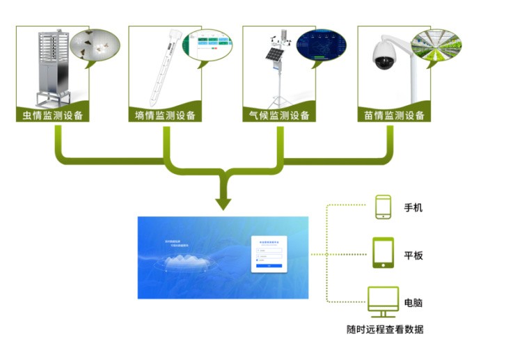 农业四情测报平台是集虫情、气象、墒情监测为一体在线监控平台。虫情监测具有Al害虫自动识别、远程实时查看虫情、虫情在线分析、害虫种类自动识别、区域虫情统计、虫情变化趋势分析、设备监测等功能。气象监测具有远程实时查看气象、在线分析气象历史数据的功能。墒情监测具有远程获取土壤墒情(如土壤温湿度、水分、PH)数据、在线分析土壤墒情历史数据的功能。